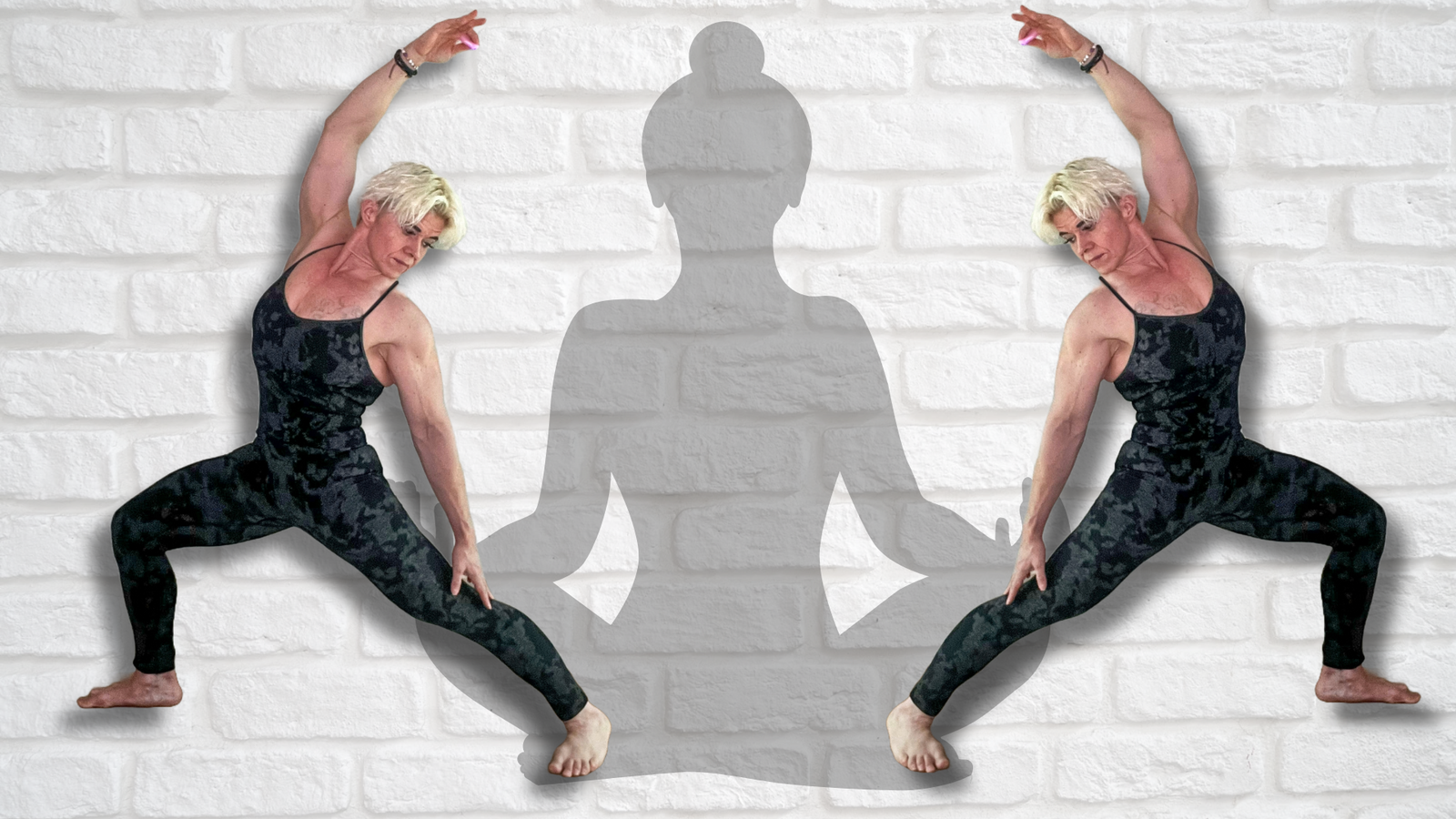 How to Do It: Stand with your feet wide apart. Turn your right foot out 90 degrees and your left foot slightly in. Extend your arms parallel to the floor. Reach forward with your right hand and lower it to your shin, ankle, or the floor. Extend your left arm towards the ceiling and look up. Hold and then switch sides.